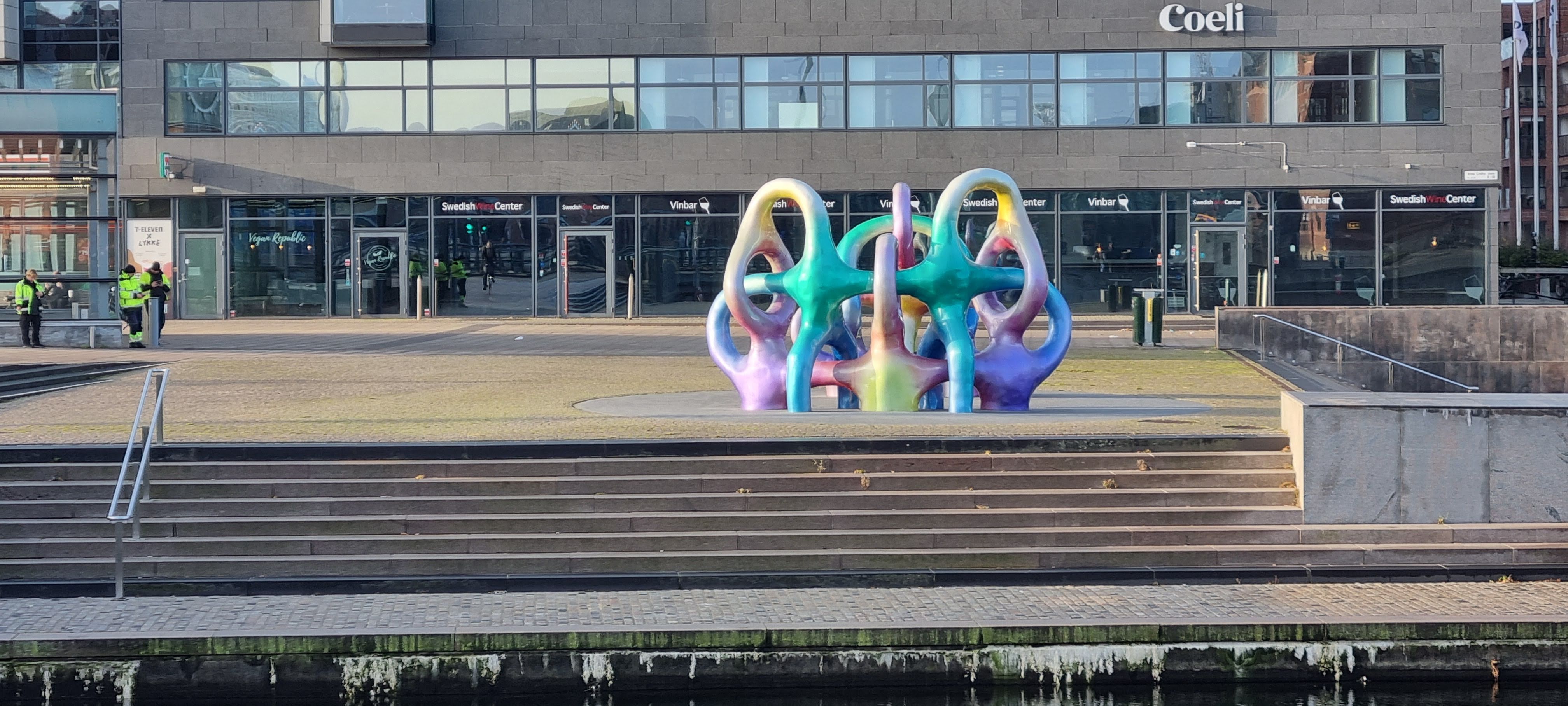På Anna Lindhs Plats, lige overfor, står værket “Spectral Self Container” og lyser op. En stor farvestrålende skulptur i to dele, som i dén grad vækker opsigt med sine regnbuefarver og sine organiske former.