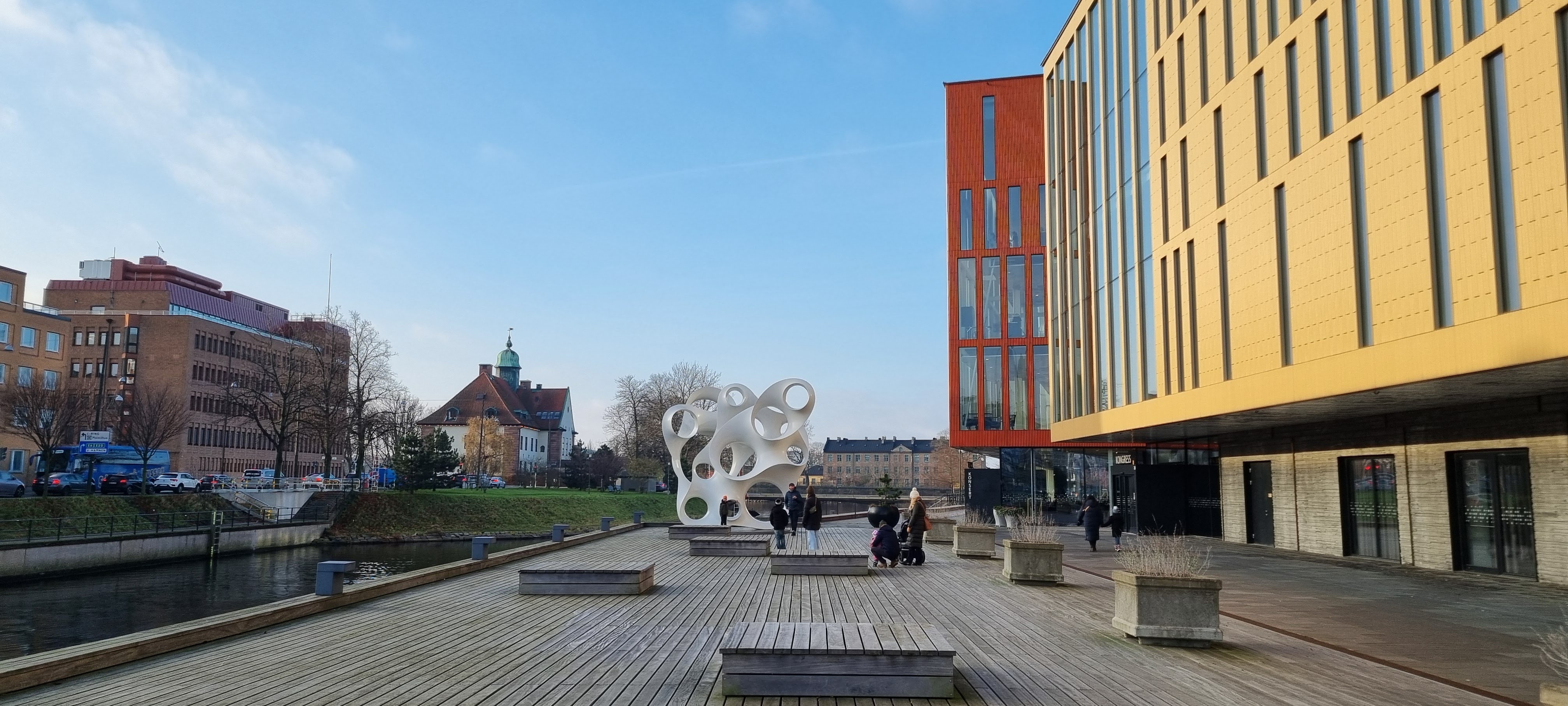 Foran Konserthuset (Malmö Live) står skulpturen “Rubato” af Eva Hild. Den hvidmalede aluminiums-skulptur overlader det hele til fantasien – her findes ingen forklaring på den spændende formgivning, og du kan tolke den som du vil. Den er monumental: 6 x 7 meter! Et virkelig smukt værk, som på en eller anden måde tilfører området præcis det spræl der er brug for, her hvor kulturen udfolder sig bag den stringente gul/orange væg.